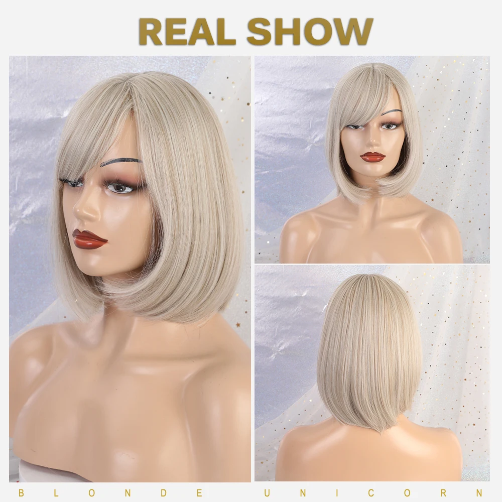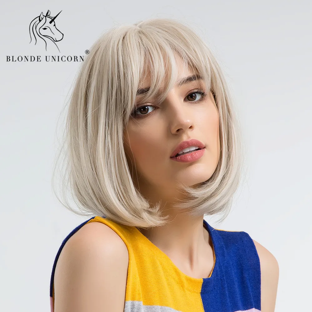 BLONDE UNICORN Natural Short Bob Wig 12 Inch Straight Synthetic Hair Cosplay Wig With Bangs Lolita