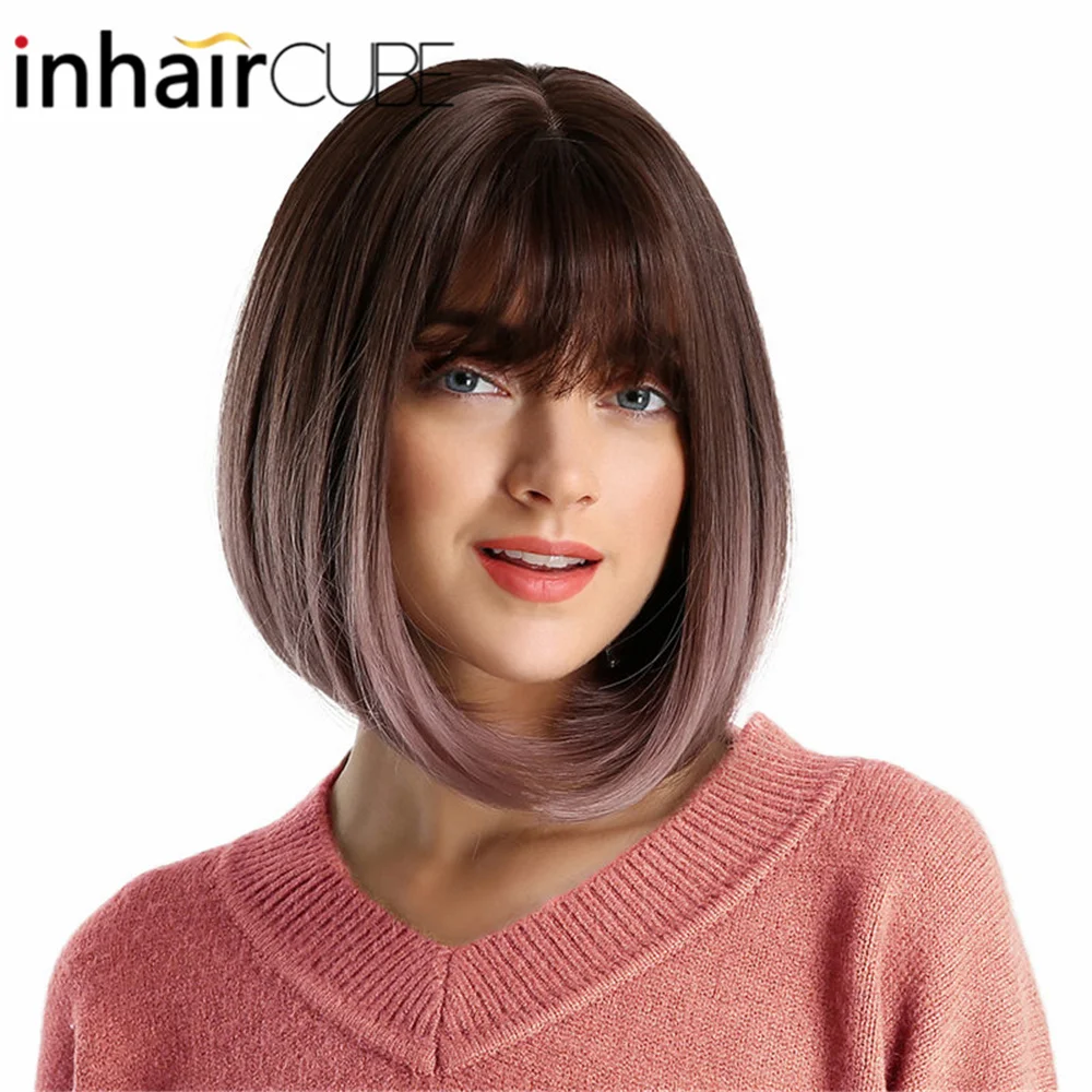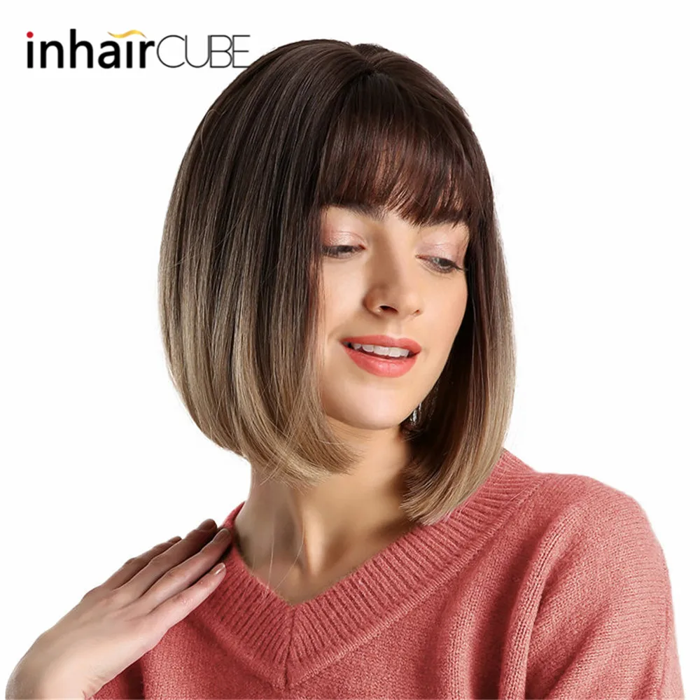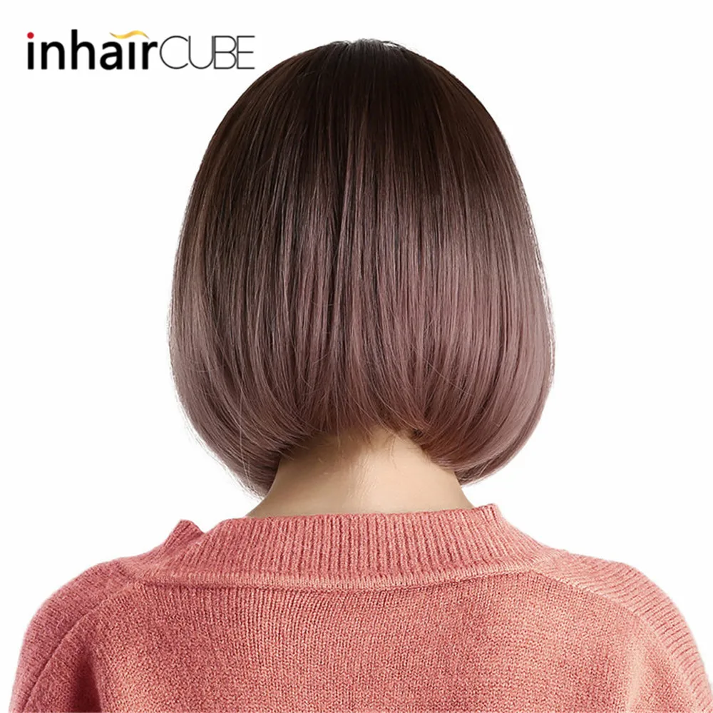 ORIGINAL Inhair Cube 10 Inches Bob Synthetic Flat Bangs Women Wig Ombre with Highlight Short Straight Hair W