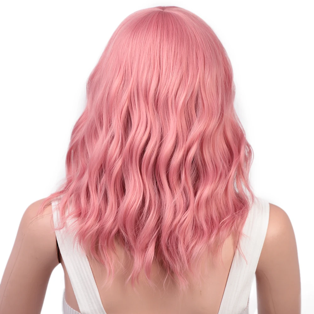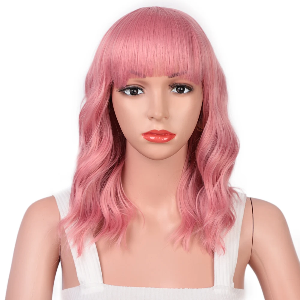 BEST SELLER Stamped Glorious 14inches Natural Wave Wig Pink Wig With Neat Bangs Synthetic Short Wigs for Women