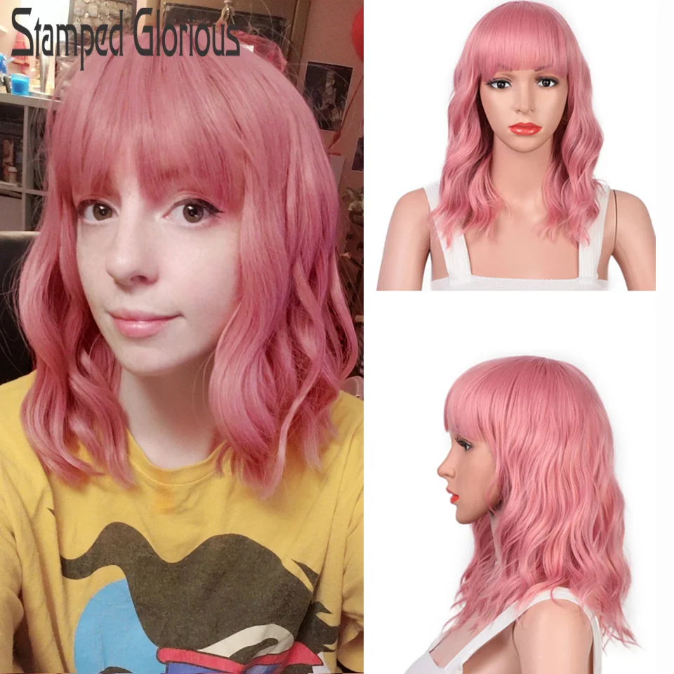 Stamped Glorious 14inches Natural Wave Wig Pink Wig With Neat Bangs Synthetic Short Wigs for Women