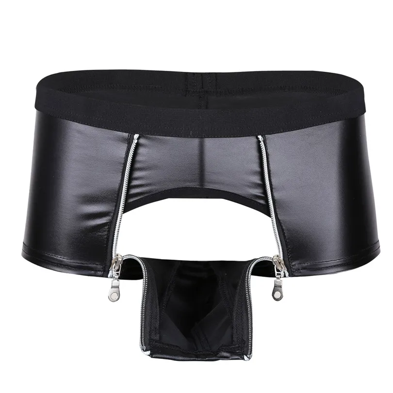 BEST TiaoBug Sexy Black Faux Leather Low-Rise Stretchy Men Boxer Shorts Underwear Bulge Pouch Double Zip