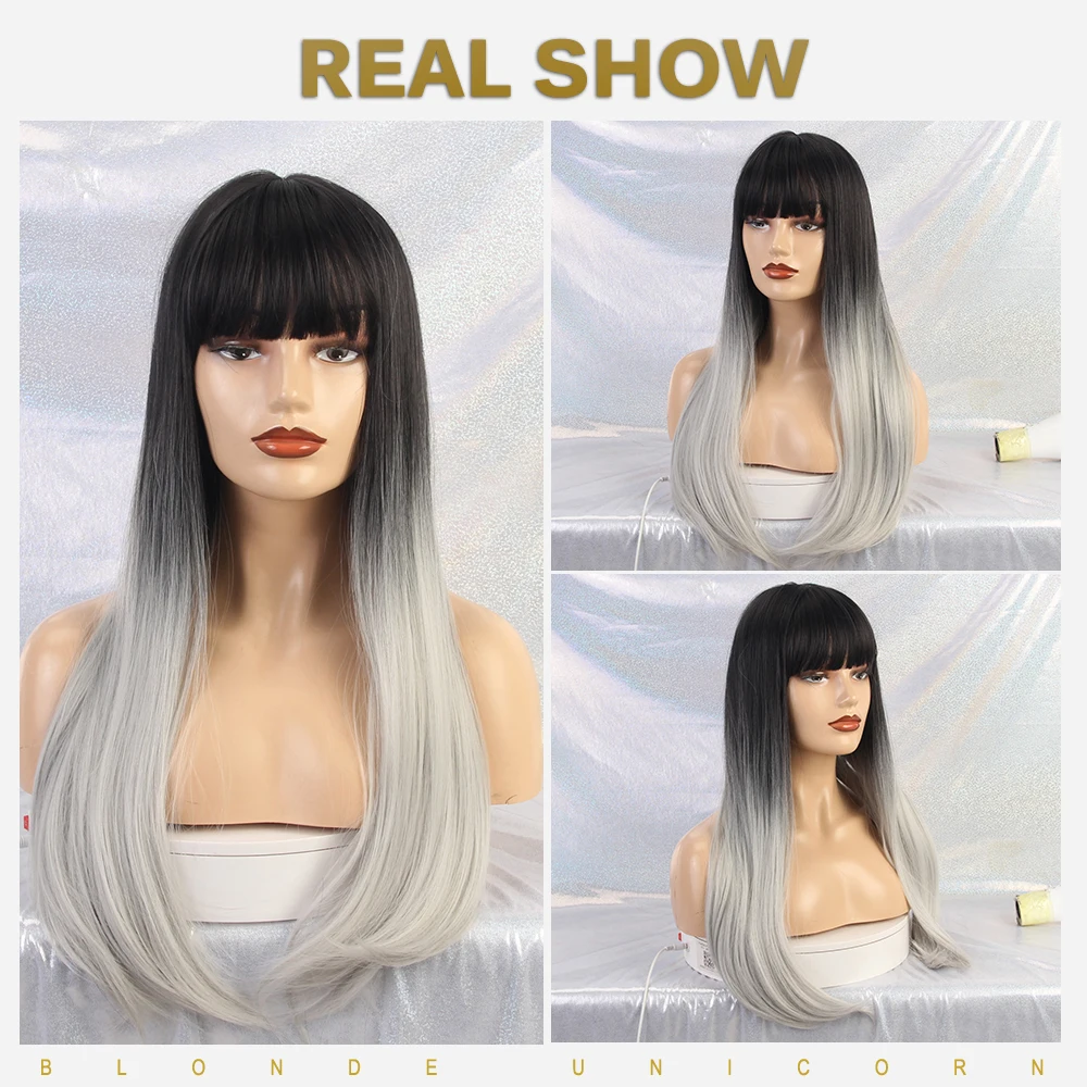 Element 26 inch Long Straight Synthetic Wig Black Root Ombre White Fashion Cosplay Party Wigs for W